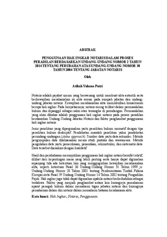 ATIKAH , YUHANA PUTRI (2026) PENGGUNAAN HAK INGKAR NOTARIS DALAM PROSES PERADILAN BERDASARKAN UNDANG-UNDANG NOMOR 2 TAHUN 2014 TENTANG PERUBAHAN ATAS UNDANG-UNDANG NOMOR 30 TAHUN 2004 TENTANG JABATAN NOTARIS. FAKULTAS HUKUM , UNIVERSITAS LAMPUNG.