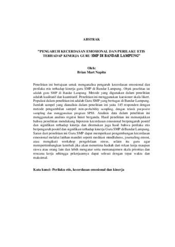Brian Mart , Napitu (2026) PENGARUH KECERDASAN EMOSIONAL DAN PERILAKU ETIS TERHADAP KINERJA GURU SMP DI BANDAR LAMPUNG. FAKULTAS EKONOMI DAN BISNIS, UNIVERSITAS LAMPUNG.