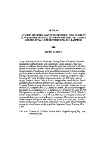 ANNISA , WIBOWO (2026) ANALISIS STRUKTUR KOMUNITAS PERIFITON PADA SUBSTRAT YANG BERBEDA DI SUNGAI BRONJONG WAY LIMA, KECAMATAN GEDONG TATAAN, KABUPATEN PESAWARAN, LAMPUNG. FAKULTAS PERTANIAN, UNIVERSITAS LAMPUNG.