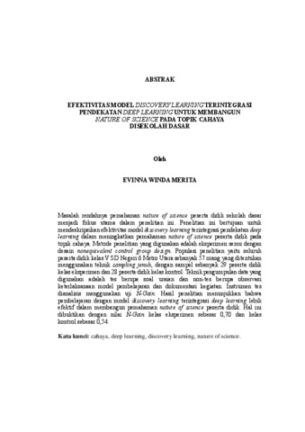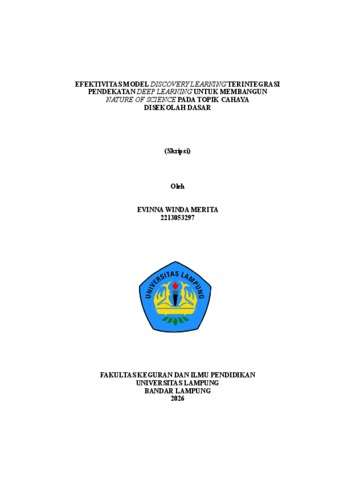 EVINNA , WINDA MERITA (2026) EFEKTIVITAS MODEL DISCOVERY LEARNING TERINTEGRASI PENDEKATAN DEEP LEARNING UNTUK MEMBANGUN NATURE OF SCIENCE PADA TOPIK CAHAYA DISEKOLAH DASAR. FAKULTAS KEGURUAN DAN ILMU PENDIDIKAN, UNIVERSITAS LAMPUNG.