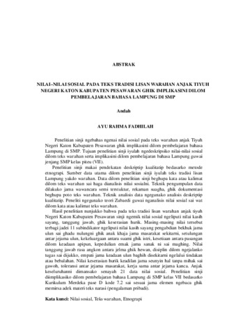 Penelitian sinji ngebahas ngenai nilai sosial pada teks warahan anjak Tiyuh Negeri Katon Kabupaten Pesawaran ghik implikasini dilom pembelajaran bahasa Lampung di SMP. Tujuan penelitian sinji iyulah ngedeskripsiko nilai-nilai sosial dilom teks warahan serta implikasini dilom pembelajaran bahasa Lampung guwai jenjang SMP kelas piteu (VII). Penelitian sinji makai pendekatan deskriptip kualitatip bedasarko metode etnograpi. Sumber data utama dilom penelitian sinji iyulah teks tradisi lisan Lampung yakdo warahan. Data dilom penelitian sinji beghupa kata atau kalimat dilom teks warahan sai haga dianalisis nilai sosialni. Teknik pengumpulan data dilakuko jama wawancara semi terstuktur, rekaman suagha, ghik dokumentasi beghupa poto teks warahan. Teknik analisis data ngegunako analisis deskriptip kualitatip. Peneliti ngegunako teori Zubaedi guwai nganalisis nilai sosial sai wat dilom kata atau kalimat teks warahan. Hasil penelitian nunjukko bahwa pada teks tradisi lisan warahan anjak tiyuh Negeri Katon Kabupaten Pesawaran sinji ngemik nilai sosial ngeliputi nilai kasih sayang, tanggung jawab, ghik keserasian hurik. Masing-masing nilai tersebut terbagi jadei 11 subindikator ngeliputi nilai kasih sayang pengabdian bekhuk jama ulun sai ghadu nulungni ghik anak khaja jama masarakat sekitarni, setulungan antar jejama ulun, kekeluargaan antara suami ghik istri, kesetiaan antara pasangan dilom keadaan apipun, kepedulian emak jama sanak ni sai maghing. Nilai tanggung jawab rasa angkon antara jelma ghik hewan, disiplin dilom ngejalanko tugas sai dijukko, empati jama keadaan ulun baghih disekitarni ngelalui tindakan atau bebalahan. Nilai keserasian hurik keadilan jama seunyin hal tanpa mihak sai gawoh, toleransi antar jejama masarakat, kerja sama antar jejama kanca. Anjak keseluruhanni dimansako senayah 21 data nilai sosial. Penelitian sinji diimplikasiko dilom pembelajaran bahasa Lampung di SMP kelas VII bedasarko Kurikulum Merdeka pase D kode 7.2 sai sesuai jama elemen ngebaca ghik memirsa adek materi teks narasi (pengalaman pribadi). Kata kunci: Nilai sosial, Teks warahan, Etnograpi