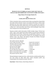 Glukosa merupakan salah satu produk industri kimia yang digunakan sebagai bahan baku dalam industri makanan, farmasi, dan produksi kimia lainnya. Glukosa dapat diproduksi dari sabut kelapa melalui proses hidrolisis enzimatik dan fermentasi. Penyediaan kebutuhan utilitas pabrik berupa sistem pengolahan dan penyediaan air, cooling water, sistem penyediaan udara kering, sistem pembangkit tenaga listrik, sistem refrigerasi dan sistem pembakaran gas. Kapasitas produksi pabrik direncanakan 40.000 ton/tahun dengan 330 hari kerja dalam 1 tahun. Lokasi pabrik direncanakan didirikan di daerah industri Kabupaten Indragiri Hilir, Provinsi Riau. Tenaga kerja yang dibutuhkan sebanyak 113 orang dengan bentuk badan usaha Perseroan Terbatas (PT) yang dipimpin oleh seorang Direktur Utama yang dibantu oleh Direktur Produksi dan Direktur Keuangan dengan struktur organisasi line and staff. Dari analisis ekonomi, diperoleh : Fixed Capital Investment (FCI) = Rp.691.852.144.024,57 Working Capital Investment (WCI) = Rp.172.963.036.006,14 Total Cost Invesment (TCI) = Rp.864.815.180.030,71 Break Event Point (BEP) = 59,78% Shut Down Point (SDP) = 23,15% Pay Out Time after Taxes (POT) a = 2,920 tahun Return on Investment before taxes (ROI) b = 24,25% Return on Investment after taxes (ROI) a = 19,40% Discounted Cash Flow (DCF) = 51,31% Mempertimbangkan rangkuman di atas, sudah selayaknya pendirian pabrik glukosa dari sabut kelapa ini dikaji lebih lanjut, karena merupakan pabrik yang menguntungkan dan mempunyai prospek yang baik. Kata Kunci : Pabrik Glukosa, Sabut Kelapa, Reaktor-01 abstract Glucose is one of the important chemical industry products used as raw material in the food, pharmaceutical, and other chemical production industries. Glucose can be produced from coconut fiber through phosphoric acid hydrolysis and fermentation processes. The required plant utilities include water treatment and supply systems, cooling water systems, dry air supply systems, power generation systems, refrigeration systems, and gas combustion systems. The plant is designed with a production capacity of 40,000 tons per year, operating 330 days annually. The proposed plant location is the industrial area of Indragiri Hilir Regency, Riau Province. The workforce requirement is 113 employees. The business entity will be established as a Limited Liability Company (PT), led by a President Director, assisted by a Production Director and a Finance Director, with an organizational structure based on the line-and-staff model. From the economic analysis, the following results were obtained : Fixed Capital Investment (FCI) = Rp. 691.852.144.024,57 Working Capital Investment (WCI) = Rp. 172.963.036.006,14 Total Cost Invesment (TCI) = Rp. 864.815.180.030,71 Break Event Point (BEP) = 59,78% Shut Down Point (SDP) = 23,15% Pay Out Time after Taxes (POT) a = 2,920 years Return on Investment before taxes (ROI) b = 24,25% Return on Investment after taxes (ROI) a = 19,40% Discounted Cash Flow (DCF) = 51,31% Considering the summary above, the establishment of this glucose plant deserves further evaluation, as it is a profitable project with strong future prospects. Keywords : Glucose Plant, Coconut Fiber, Reactor-01