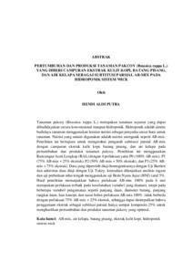 Tanaman pakcoy (Brassica rappa L.) merupakan tanaman sayuran yang dapat dibudidayakan secara konvensional maupun hidroponik. Hidroponik adalah sistem budidaya tanaman menggunakan larutan nutrisi sebagai penyedia unsur hara untuk tanaman. Nutrisi yang umum digunakan adalah nutrisi anorganik seperti AB-mix. Penelitian ini bertujuan untuk mengetahui pengaruh subtisusi parsial AB-mix dengan campuran ekstrak kulit kopi, batang pisang, dan air kelapa pada pertumbuhan dan produksi tanaman pakcoy. Penelitian ini menggunakan Rancangan Acak Lengkap (RAL) dengan 4 perlakuan yaitu P0 (100% AB-mix), P1 (75% AB-mix + 25% ekstrak), P2 (50% AB-mix + 50% ekstrak), dan P3 (25% AB-mix + 75% ekstrak). Data yang diperoleh diuji homogenitasnya dengan Uji Bartlett dan aditivitas data diuji dengan Uji Tukey, kemudian dilanjutkan analisis ragam dan uji perbedaan nilai tengah menggunakan uji Beda Nyata Jujur (BNJ) taraf 5%. Hasil penelitian menunjukkan bahwa perlakuan AB-mix 100% pada 6 mst merupakan perlakuan terbaik pada keseluruhan variabel yang diamati, tetapi pada beberapa variabel pengamatan seperti panjang daun, diameter batang, panjang tangkai daun, luas kanopi, dan susut bobot perlakuan AB-mix 100% tidak berbeda dengan perlakuan 75% AB-mix + 25% ekstrak, sehingga dapat disimpulkan bahwa penggunaan ekstrak sebagai subtitusi parsial hanya sampai komposisi 25% untuk menghasilkan pertumbuhan dan produksi tanaman pakcoy yang optimal. Kata kunci: AB-mix, air kelapa, batang pisang, ekstrak kulit kopi, hidroponik sistem wick