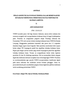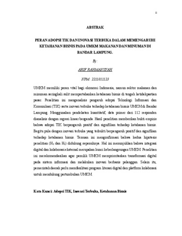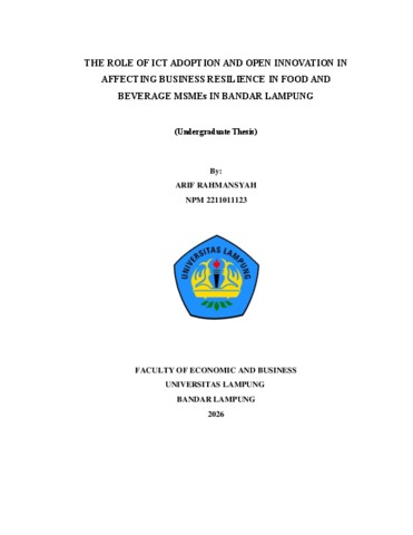 Arif, Rahmansyah (2026) THE ROLE OF ICT ADOPTION AND OPEN INNOVATION IN AFFECTING BUSINESS RESILIENCE IN FOOD AND BEVERAGE MSMEs IN BANDAR LAMPUNG. FAKULTAS EKONOMI DAN BISNIS, UNIVERSITAS LAMPUNG.