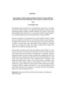 Permasalahan dalam penelitian ini adalah bagaimana nilai moral yang ada dalambuku Sikancil Dari Lampung I serta bagaimana pengimplikasiannya dalampembelajaran bahasa lampung di SMP. Penelitian ini memiliki tujuan untuk mendeskripsikan nilai-nilai moral yang ada dalam buku SiKancil Dari Lampung I serta implikasinya dalam pembelajaran Bahasa Lampung di (SMP). Metode yang digunakan dalam penelitian ini adalah deskriptif kualitatif. Sumberdata berasal dari teks cerita fabel yang ada dalam buku sikancil Dari lampung IPengumpulan data dilakukan dengan metode dokumentasi yaitu menggunakandata dalam buku yang sudah ada, sedangkan analisis data yang digunakan yaitudengan analisis isi melalui kata, kalimat, serta dialog dalam teks fabel yangmencerminkan nilai moral. Hasil penelitian menunjukkan bahwa dalam buku Si Kancil Dari Lampung I terdapat tiga kategori nilai moral, yaitu nilai moral individual, nilai moral sosial, dan nilai moral religi. Nilai moral individual yang ditemukan meliputi kepatuhan,keberanian, keikhlasan, berkorban, kejujuran, keadilan, kebijaksanaan,penghormatan terhadap orang lain, kerja keras, menepati janji, tahu balas budi,dan kerendahan hati. Nilai moral sosial meliputi sikap kerja sama, tanggung jawab, tolong menolong, dan kepedulian terhadap sesama. Sementara itu, nilamoral religi meliputi pengakuan kepada Tuhan, berdo’a, bersyukur, danketakwaan. Sehingga diperoleh hasil penelitian sebanyak 53 data. Hal ini dapadigunakan sebagai alternatif bahan pembelajaran Bahasa Lampung di SMP yang mengacu pada kode D.7.1 dengan tujuan pembelajaran (TP) murid mampumenganalisis unsur instrinsik yang terdapat dalam fabel pada mata pelajaranBahasa dan Aksara Lampung kelas VII. Kata kunci: nilai moral, fabel, buku Si Kancil dari Lampung I, pembelajaranBahasa Lampung