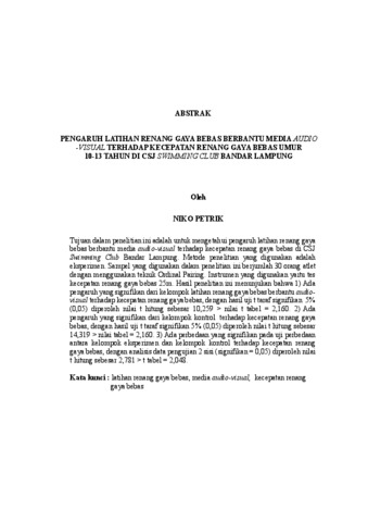 Tujuan dalam penelitian ini adalah untuk mengetahui pengaruh latihan renang gaya bebas berbantu media audio-visual terhadap kecepatan renang gaya bebas di CSJ Swimming Club Bandar Lampung. Metode penelitian yang digunakan adalah eksperimen. Sampel yang digunakan dalam penelitian ini berjumlah 30 orang atlet dengan menggunakan teknik Ordinal Pairing. Instrumen yang digunakan yaitu tes kecepatan renang gaya bebas 25m. Hasil penelitian ini menunjukan bahwa 1) Ada pengaruh yang signifikan dari kelompok latihan renang gaya bebas berbantu audiovisual terhadap kecepatan renang gaya bebas, dengan hasil uji t taraf signifikan 5% (0,05) diperoleh nilai t hitung sebesar 10,259 > nilai t tabel = 2,160. 2) Ada pengaruh yang signifikan dari kelompok kontrol terhadap kecepatan renang gaya bebas, dengan hasil uji t taraf signifikan 5% (0,05) diperoleh nilai t hitung sebesar 14,319 > nilai tabel = 2,160. 3) Ada perbedaan yang signifikan pada uji perbedaan antara kelompok eksperimen dan kelompok kontrol terhadap kecepatan renang gaya bebas, dengan analisis data pengujian 2 sisi (signifikan = 0,05) diperoleh nilai t hitung sebesar 2,781 > t tabel = 2,048.