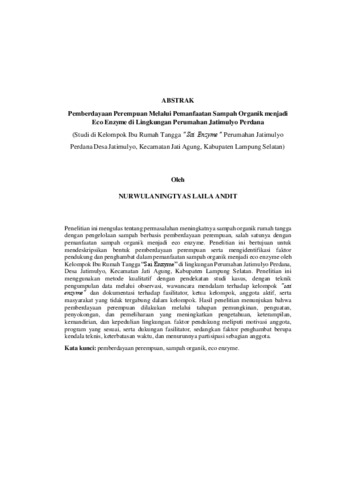 Nurwulaningtyas Laila , Andit (2026) Pemberdayaan Perempuan Melalui Pemanfaatan Sampah Organik menjadi Eco Enzyme di Lingkungan Perumahan Jatimulyo Perdana (Studi di Kelompok Ibu Rumah Tangga “Sai Enzyme” Perumahan Jatimulyo Perdana Desa Jatimulyo, Kecamatan Jati Agung, Kabupaten Lampung Selatan). FAKULTAS ILMU SOSIAL DAN ILMU POLITIK, UNIVERSITAS LAMPUNG.