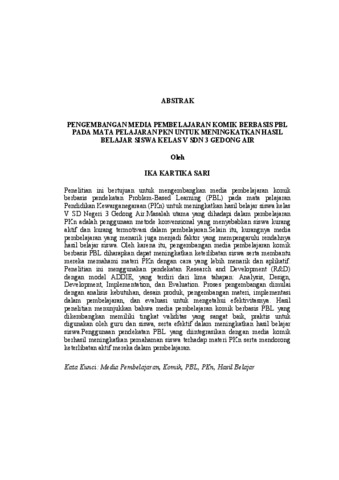 Penelitian ini bertujuan untuk mengembangkan media pembelajaran komik berbasis pendekatan Problem-Based Learning (PBL) pada mata pelajaran Pendidikan Kewarganegaraan (PKn) untuk meningkatkan hasil belajar siswa kelas V SD Negeri 3 Gedong Air.Masalah utama yang dihadapi dalam pembelajaran PKn adalah penggunaan metode konvensional yang menyebabkan siswa kurang aktif dan kurang termotivasi dalam pembelajaran.Selain itu, kurangnya media pembelajaran yang menarik juga menjadi faktor yang mempengaruhi rendahnya hasil belajar siswa. Oleh karena itu, pengembangan media pembelajaran komik berbasis PBL diharapkan dapat meningkatkan keterlibatan siswa serta membantu mereka memahami materi PKn dengan cara yang lebih menarik dan aplikatif. Penelitian ini menggunakan pendekatan Research and Development (R&D) dengan model ADDIE, yang terdiri dari lima tahapan: Analysis, Design, Development, Implementation, dan Evaluation. Proses pengembangan dimulai dengan analisis kebutuhan, desain produk, pengembangan materi, implementasi dalam pembelajaran, dan evaluasi untuk mengetahui efektivitasnya. Hasil penelitian menunjukkan bahwa media pembelajaran komik berbasis PBL yang dikembangkan memiliki tingkat validitas yang sangat baik, praktis untuk digunakan oleh guru dan siswa, serta efektif dalam meningkatkan hasil belajar siswa.Penggunaan pendekatan PBL yang diintegrasikan dengan media komik berhasil meningkatkan pemahaman siswa terhadap materi PKn serta mendorong keterlibatan aktif mereka dalam pembelajaran. Kata Kunci: Media Pembelajaran, Komik, PBL, PKn, Hasil Belajar This study aims to develop comic-based learning media using the Problem-Based Learning (PBL) approach in the subject of Civic Education (PKn) to improve the learning outcomes of fifth-grade students at SD Negeri 3 Gedong Air. The main issue encountered in Civic Education learning is the use of conventional methods, which result in students being less active and less motivated during the learning process. Moreover, the lack of engaging learning media also contributes to the low academic performance of students. Therefore, the development of comicbased learning media integrated with PBL is expected to enhance student engagement and help them understand Civic Education material in a more appealing and applicable manner. This research employs a Research and Development (R&D) approach using the ADDIE model, which consists of five stages: Analysis, Design, Development, Implementation, and Evaluation. The development process begins with needs analysis, followed by product design, material development, classroom implementation, and evaluation to assess its effectiveness. The results indicate that the developed comic-based learning media using PBL possesses a very high level of validity, is practical for use by both teachers and students, and is effective in improving student learning outcomes. The integration of the PBL approach with comic media successfully enhances students’ understanding of Civic Education content and encourages their active participation in learning. Keywords: Learning Media, Comic, PBL, PKn, Learning Outcomes