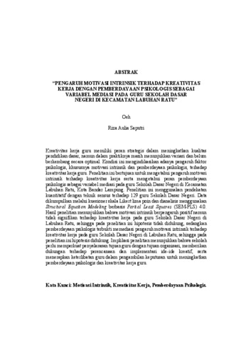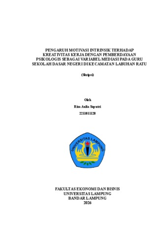 Riza Aulia , Saputri (2026) PENGARUH MOTIVASI INTRINSIK TERHADAP KREATIVITAS KERJA DENGAN PEMBERDAYAAN PSIKOLOGIS SEBAGAI VARIABEL MEDIASI PADA GURU SEKOLAH DASAR NEGERI DI KECAMATAN LABUHAN RATU. FAKULTAS EKONOMI DAN BISNIS, UNIVERSITAS LAMPUNG.
