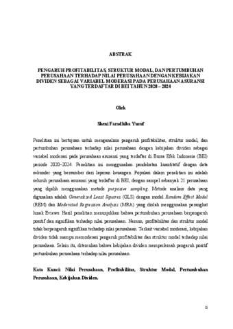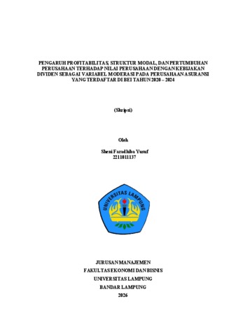 Sheni Faradhiba , Yusuf (2026) PENGARUH PROFITABILITAS, STRUKTUR MODAL, DAN PERTUMBUHAN PERUSAHAAN TERHADAP NILAI PERUSAHAAN DENGAN KEBIJAKAN DIVIDEN SEBAGAI VARIABEL MODERASI PADA PERUSAHAAN ASURANSI YANG TERDAFTAR DI BEI TAHUN 2020 – 2024. FAKULTAS EKONOMI DAN BISNIS, UNIVERSITAS LAMPUNG.