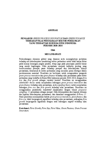 Perkembangan ekonomi global yang dinamis serta meningkatnya perhatian terhadap isu keberlanjutan mendorong sektor perbankan untuk tidak hanya fokus pada kinerja keuangan jangka pendek, tetapi juga pada penerapan praktik bisnis yang ramah lingkungan. Nilai perusahaan menjadi indikator penting yang mencerminkan persepsi pasar terhadap prospek dan keberlanjutan kinerja perusahaan, khususnya di sektor perbankan yang memiliki peran strategis dalam perekonomian nasional. Penelitian ini bertujuan untuk menganalisis pengaruh green process innovation dan green finance terhadap nilai perusahaan pada sektor perbankan yang terdaftar di Bursa Efek Indonesia periode 2020–2024, dengan firm size dan firm growth sebagai variabel kontrol. Penelitian ini menggunakan stakeholder theory untuk menjelaskan hubungan green process innovation dan green finance terhadap nilai perusahaan, serta signaling theory untuk menjelaskan hubungan firm size dan firm growth terhadap nilai perusahaan. Penelitian ini menggunakan pendekatan kuantitatif eksplanatori dengan teknik purposive sampling, 12 perusahaan sebagai sampel. Data dikumpulkan dari laporan tahunan dan laporan keberlanjutan perusahaan, dan dianalisis menggunakan E-Views 12. Hasil penelitian menunjukkan bahwa green process innovation, green finance, dan firm size tidak berpengaruh signifikan terhadap nilai perusahaan, sedangkan firm growth berpengaruh signifikan dengan arah hubungan negatif terhadap nilai perusahaan. Kata kunci: Firm Growth, Firm Size, Firm Value, Green Finance, Green Process Innovation. Dynamic global economic developments and increasing attention to sustainability issues are encouraging the banking sector to focus not only on short-term financial performance but also on implementing environmentally friendly business practices. Firm value is an important indicator reflecting market perceptions of the prospects and sustainability of a company's performance, particularly in the banking sector, which plays a strategic role in the national economy. This study aims to analyze the effect of green process innovation and green finance on firm value in the banking sector listed on the Indonesia Stock Exchange for the 2020–2024 period, with firm size and firm growth as control variables. This study uses stakeholder theory to explain the relationship between green process innovation and green finance and firm value, and signaling theory to explain the role of firm size and firm growth on firm value. This study uses a quantitative explanatory approach with a purposive sampling technique, selecting 12 companies as samples. Data were collected from annual reports and corporate sustainability reports, and analyzed using E-Views 12. The results show that green process innovation, green finance, and firm size have no significant effect on firm value, while firm growth has a significant, negative effect on firm value. Keywords: Firm Growth, Firm Size, Firm Value, Green Finance, Green Process Innovation.