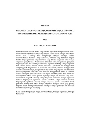 VIOLA, OCHA MAHARANI (2026) PENGARUH LINGKUNGAN KERJA, MOTIVASI KERJA, DAN BUDAYA ORGANISASI TERHADAP KINERJA KARYAWAN LAMPUNG POST. FAKULTAS ILMU SOSIAL DAN ILMU POLITIK , UNIVERSITAS LAMPUNG.