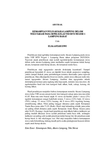 ELSA ASTARI , DWI (2026) KEMAMPUAN NULIS AKSARA LAMPUNG DELOM TEKS NARASI PADA SISWA KELAS VIII MTS NEGERI 1 LAMPUNG BARAT. FAKULTAS KEGURUAN DAN ILMU PENDIDIKAN, UNIVERSITAS LAMPUNG.