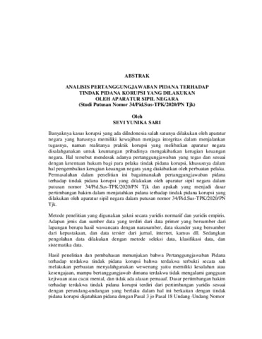 SEVI YUNIKA, SARI (2025) ANALISIS PERTANGGUNGJAWABAN PIDANA TERHADAP TINDAK PIDANA KORUPSI YANG DILAKUKAN OLEH APARATUR SIPIL NEGARA (Studi Putusan Nomor 34/Pid.Sus-TPK/2020/PN Tjk). FAKULTAS HUKUM, UNIVERSITAS LAMPUNG.