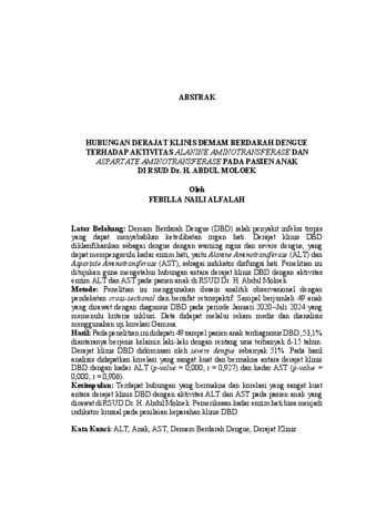 FEBILLA, NAILI ALFALAH (2025) HUBUNGAN DERAJAT KLINIS DEMAM BERDARAH DENGUE TERHADAP AKTIVITAS ALANINE AMINOTRANSFERASE DAN ASPARTATE AMINOTRANSFERASE PADA PASIEN ANAK DI RSUD Dr. H. ABDUL MOLOEK. FAKULTAS KEDOKTERAN, UNIVERSITAS LAMPUNG.