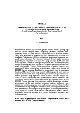 ALVINA, RAHMA (2026) KEPEMIMPINAN TRANSFORMATIF DALAM MENINGKATKAN PENGEMBANGAN SUMBER DAYA MANUSIA (Studi di Badan Pengembangan Sumber Daya Manusia Daerah Provinsi Lampung). FAKULTAS ILMU SOSIAL DAN ILMU POLITIK, UNIVERSITAS LAMPUNG.