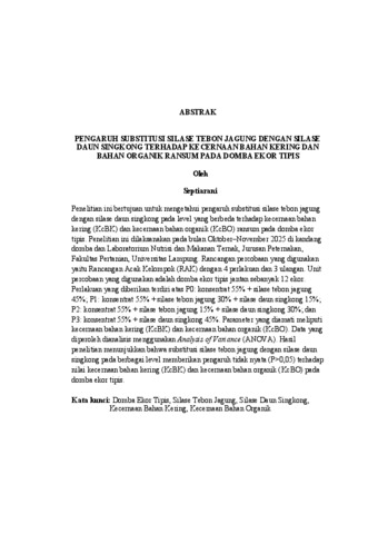 Septiarani, Septiarani (2026) PENGARUH SUBSTITUSI SILASE TEBON JAGUNG DENGAN SILASE DAUN SINGKONG TERHADAP KECERNAAN BAHAN KERING DAN BAHAN ORGANIK RANSUM PADA DOMBA EKOR TIPIS. FAKULTAS PERTANIAN, UNIVERSITAS LAMPUNG.