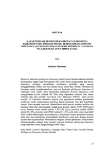 Reservoir karbonat globigerina limestone pada Formasi Mundu dikenal memiliki heterogenitas tinggi yang dipengaruhi oleh variasi fasies pengendapan dan proses diagenesa, sehingga memerlukan pendekatan geofisika yang mampu menggambarkan variasi sifat fisis batuan secara lateral dan vertikal. Penelitian ini bertujuan untuk mengkarakterisasi reservoir karbonat globigerina limestone di Cekungan Jawa Timur Utara berdasarkan parameter Acoustic Impedance (AI) menggunakan inversi seismik 3D. Data yang digunakan meliputi satu sumur referensi dan data seismik Post-Stack Time Migration (PSTM). Hasil inversi seismik 3D kemudian dianalisis melalui peta persebaran berbasis pendekatan arithmetic untuk mengevaluasi distribusi lateral parameter fisis dan petrofisika batuan. Zona prospek reservoir diidentifikasi pada puncak struktur antiklin dan dicirikan oleh nilai AI menengah–rendah pada kisaran sekitar 3.500–4.000 (g/cc) (m/s), densitas relatif rendah sekitar 1,50–1,80 (g/cc), porositas efektif (PHIE) sekitar 30–40%, porositas total (PHIT) sekitar 45–55%, serta nilai vclay yang relatif lebih rendah dibandingkan area sekitarnya. Konsistensi respon parameter tersebut pada peta dan penampang menunjukkan keterkaitan yang kuat dengan kontrol struktur bawah permukaan. Berdasarkan integrasi seluruh parameter, zona tersebut diinterpretasikan sebagai zona prospek reservoir karbonat globigerina limestone yang berpotensi untuk pengembangan lebih lanjut. Kata Kunci: Acoustic Impedance, Cekungan Jawa Timur Utara, Formasi Mundu, Globigerina Limestone, Inversi Seismik.