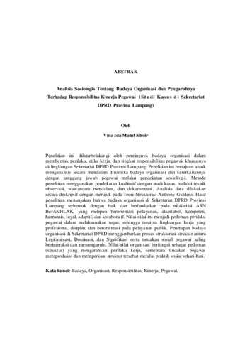 VINA IDA MATUL, KHOIR (2026) ANALISIS SOSIOLOGIS TENTANG BUDAYA ORGANISASI DAN PENGARUHNYA TERHADAP RESPONSIBILITAS KINERJA PEGAWAI (STUDI KASUS DI SEKRETARIAT DPRD PROVINSI LAMPUNG). FAKULTAS ILMU SOSIAL DAN ILMU POLITIK, UNIVERSITAS LAMPUNG.