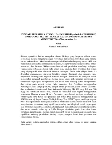 Sistem reproduksi betina merupakan sistem biologis yang berperan dalam proses reproduksi melalui pengaturan organ reproduksi dan hormon reproduksi yang bekerja secara terkoordinasi. Aktivitas sistem reproduksi betina berlangsung secara siklik dan pada mencit ditunjukkan melalui siklus estrus, yang terdiri atas fase proestrus, estrus, metestrus, dan diestrus. Siklus estrus ditandai oleh perubahan morfologi sel epitel vagina serta perbedaan durasi pada setiap fase, terutama fase proestrus dan estrus, yang dipengaruhi oleh fluktuasi hormon estrogen. Daun sirih (Piper betle L.) diketahui mengandung senyawa bioaktif, seperti flavonoid dan saponin, yang berpotensi memengaruhi regulasi hormon estrogen. Penelitian ini bertujuan untuk mengetahui pengaruh pemberian ekstrak etanol daun sirih terhadap morfologi sel epitel ulas vagina pada fase proestrus dan estrus serta terhadap durasi fase proestrus dan estrus pada mencit betina (Mus musculus L.). Penelitian menggunakan Rancangan Acak Lengkap (RAL) dengan empat perlakuan, yaitu kontrol (akuades) dan pemberian ekstrak etanol daun sirih dosis 300 mg/g BB, 400 mg/g BB, dan 500 mg/g BB diberikan secara oral, setelah itu dilakukan ulas vagina menggunakan pewarnaan Giemsa selama 14 hari. Parameter yang diamati meliputi morfologi sel epitel vagina serta durasi fase proestrus dan estrus. Data dianalisis menggunakan uji ANOVA dan uji lanjut Duncan Multiple Range Test (DMRT) pada taraf kepercayaan 95%. Hasil penelitian menunjukkan bahwa pemberian ekstrak etanol daun sirih tidak menyebabkan perubahan yang signifikan terhadap morfologi sel epitel vagina pada fase proestrus dan estrus, serta tidak berpengaruh nyata terhadap durasi fase proestrus dan estrus mencit betina (p > 0,05). Dengan demikian, pada dosis dan durasi perlakuan penelitian ini, ekstrak etanol daun sirih belum menunjukkan pengaruh yang signifikan terhadap perubahan sitologi vagina maupun durasi fase proestrus dan estrus mencit betina. Kata kunci : sistem reproduksi betina, siklus estrus, ulas vagina, sel epitel vagina, Piper betle L.