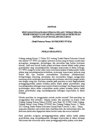 PINKAN, RESANNITA (2026) PERTANGGUNGJAWABAN PIDANA PELAKU TINDAK PIDANA PERSETUBUHAN YANG MENYALAHGUNAKAN HUBUNGAN KEPERCAYAAN DI DALAM KELUARGA (Studi Putusan Nomor 161/Pid.B/2023 PN Kla). FAKULTAS HUKUM , UNIVERSITAS LAMPUNG.