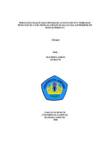 MAUREEN , ASIKIN (2026) PERTANGGUNGJAWABAN PENGELOLA PANTAI MUTUN TERHADAP PENGUNJUNG YANG MENGALAMI KECELAKAAN DALAM PERSPEKTIF HUKUM PERDATA. FAKULTAS HUKUM , UNIVERSITAS LAMPUNG.