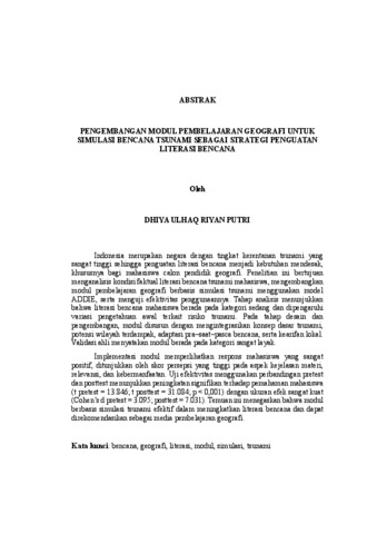 Indonesia merupakan negara dengan tingkat kerentanan tsunami yang sangat tinggi sehingga penguatan literasi bencana menjadi kebutuhan mendesak, khususnya bagi mahasiswa calon pendidik geografi. Penelitian ini bertujuan menganalisis kondisi faktual literasi bencana tsunami mahasiswa, mengembangkan modul pembelajaran geografi berbasis simulasi tsunami menggunakan model ADDIE, serta menguji efektivitas penggunaannya. Tahap analisis menunjukkan bahwa literasi bencana mahasiswa berada pada kategori sedang dan dipengaruhi variasi pengetahuan awal terkait risiko tsunami. Pada tahap desain dan pengembangan, modul disusun dengan mengintegrasikan konsep dasar tsunami, potensi wilayah terdampak, adaptasi pra–saat–pasca bencana, serta kearifan lokal. Validasi ahli menyatakan modul berada pada kategori sangat layak. Implementasi modul memperlihatkan respons mahasiswa yang sangat positif, ditunjukkan oleh skor persepsi yang tinggi pada aspek kejelasan materi, relevansi, dan kebermanfaatan. Uji efektivitas menggunakan perbandingan pretest dan posttest menunjukkan peningkatan signifikan terhadap pemahaman mahasiswa (t pretest = 13.846; t posttest = 31.084; p < 0,001) dengan ukuran efek sangat kuat (Cohen’s d pretest = 3.095; posttest = 7.031). Temuan ini menegaskan bahwa modul berbasis simulasi tsunami efektif dalam meningkatkan literasi bencana dan dapat direkomendasikan sebagai media pembelajaran geografi. Kata kunci: bencana, geografi, literasi, modul, simulasi, tsunami