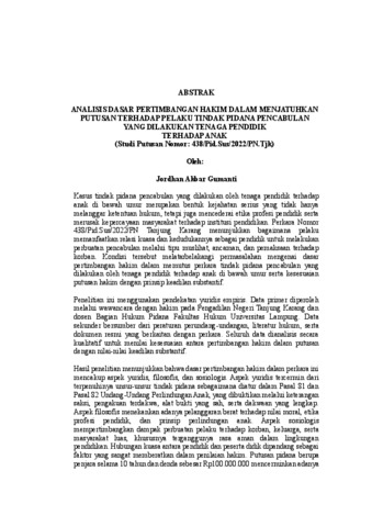 JORDHAN , AKBAR GUMANTI (2026) ANALISIS DASAR PERTIMBANGAN HAKIM DALAM MENJATUHKAN PUTUSAN TERHADAP PELAKU TINDAK PIDANA PENCABULAN YANG DILAKUKAN TENAGA PENDIDIK TERHADAP ANAK (Studi Putusan Nomor: 438/Pid.Sus/2022/PN.Tjk). FAKULTAS HUKUM, UNIVERSITAS LAMPUNG.