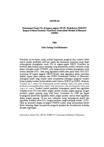 Penelitian ini bertujuan untuk melihat bagaimana pengaruh dari variabel bebas seperti jumlah penduduk, GDP per kapita dan khususnya intensitas energi dapat memengaruhi peningkatan emisi CO2 di negara-negara OECD. Penelitian ini berfokus pada analisis peran teknologi yang diproksikan melalui intensitas energi dalam kerangka model STIRPAT, serta pengaruhnya terhadap peningkatan emisi karbon dioksida (CO2). Data yang digunakan adalah data panel tahun 2010-2022 mencakup 38 negara anggota OECD.Metode yang digunakan dalam penelitian adakah regresi panel dinamis atau GMM (Generalized Method of Moments), sedangkan model yang terpilih untuk menjelaskan hubungan pengaruh variabel bebas terhadap variabel terikat adalah model System GMM (Sys-GMM). Hasilnya, Variabel lag 1 emisi CO2 berpengaruh positif terhadap emisi CO2 pada periode berikutnya mengindikasikan adanya efek persistence atau keterlanjutan emisi dari waktu ke waktu. Variabel jumlah penduduk berpengaruh positif dan signifikan terhadap emisi CO2 baik dalam jangka pendek maupun jangka panjang, dengan koefisien jangka panjang yang lebih besar. Sementara itu, GDP per kapita berpengaruh positif dan signifikan dalam jangka pendek, namun tidak signifikan dalam jangka panjang. Di sisi lain, intensitas energi berpengaruh positif dan signifikan terhadap emisi CO2, dengan koefisien jangka panjang sebesar 1,0781. Hasil ini konsisten dengan kerangka STIRPAT model, yang menunjukkan bahwa faktor teknologi dapat memperkuat pengaruh populasi dan kemakmuran terhadap dampak lingkungan. Kata kunci: Emisi CO2, OECD, STIRPAT, Generalized Method of Moments
