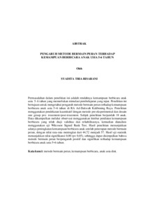 Permasalahan dalam penelitian ini adalah rendahnya kemampuan berbicara anak usia 5- 6 tahun yang memerlukan stimulasi pembelajaran yang tepat. Penelitian ini bertujuan untuk mengetahui pengaruh metode bermain peran terhadap kemampuan berbicara anak usia 5–6 tahun di RA Ad-Dakwah Kalibening Raya. Penelitian menggunakan pendekatan kuantitatif dengan metode pre-eksperimental dan desain one group pre- treatment–post-treatment. Subjek penelitian berjumlah 18 anak. Data dikumpulkan melalui observasi menggunakan lembar penilaian kemampuan berbicara yang telah diuji validitas dan reliabilitasnya, kemudian dianalisis menggunakan uji Wilcoxon Signed Rank Test. Hasil penelitian menunjukkan adanya peningkatan kemampuan berbicara anak setelah penerapan metode bermain peran, dengan nilai rata-rata meningkat dari 44,72 menjadi 57. Hasil uji statistik menunjukkan nilai signifikansi 0,00 (p< 0,05), sehingga dapat disimpulkan bahwa metode bermain peran berpengaruh positif dan signifikan terhadap kemampuan berbicara anak usia 5–6 tahun. Kata kunci: metode bermain peran, kemampuan berbicara, anak usia dini.The problem in this study is the low speaking ability of children aged 5-6 years who require appropriate learning stimulation. This study aims to determine the effect of the role-playing method on the speaking ability of children aged 5-6 years at RA Ad- Dakwah Kalibening Raya. The study used a quantitative approach with a pre- experimental method and a one-group pre-treatment-post-treatment design. The research subjects were 18 children. Data were collected through observation using a speaking ability assessment sheet that had been tested for validity and reliability, then analyzed using the Wilcoxon Signed Rank Test. The results of the study showed an increase in children's speaking ability after the application of the role-playing method, with an average value increasing from 44.72 to 57. The results of the statistical test showed a significance value of 0.00 (p<0.05), so it can be concluded that the role-playing method has a positive and significant effect on the speaking ability of children aged 5-6 years. Keywords: role-playing method, speaking ability, early childhood.