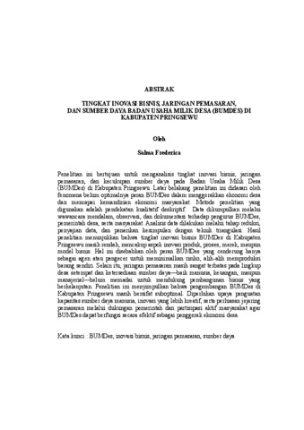 Salma, Frederica (2026) TINGKAT INOVASI BISNIS, JARINGAN PEMASARAN, DAN SUMBER DAYA BADAN USAHA MILIK DESA (BUMDES) DI KABUPATEN PRINGSEWU. FAKULTAS PERTANIAN, UNIVERSITAS LAMPUNG.