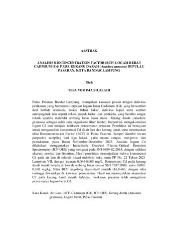 TESA , YEMIMA SILALAHI (2026) ANALISIS BIOCONCENTRATION FACTOR (BCF) LOGAM BERAT CADMIUM (Cd) PADA KERANG DARAH (Anadara granosa) DI PULAU PASARAN, KOTA BANDAR LAMPUNG. FAKULTAS MATEMATIKA DAN ILMU PENGETAHUAN ALAM , UNIVERSITAS LAMPUNG.