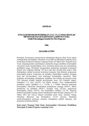 SALSABILA , FITRI (2026) EVALUASI PROGRAM PENDIDIKAN DUAL TRACK PADA SEKOLAH MENENGAH ATAS DI KABUPATEN LAMPUNG UTARA (Studi Perbandingan Kondisi Pre-Post Program). FAKULTAS ILMU SOSIAL DAN ILMU POLITIK, UNIVERSITAS LAMPUNG.
