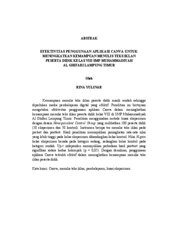 Rina, Yulinar (2026) EFEKTIVITAS PENGGUNAAN APLIKASI CANVA UNTUK MENINGKATKAN KEMAMPUAN MENULIS TEKS IKLAN PESERTA DIDIK KELAS VIII SMP MUHAMMADIYAH AL GHIFARI LAMPUNG TIMUR. FAKULTAS KEGURUAN DAN ILMU PENDIDIKAN, UNIVERSITAS LAMPUNG.