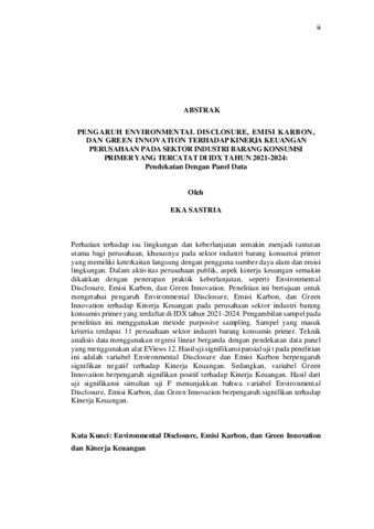 Perhatian terhadap isu lingkungan dan keberlanjutan semakin menjadi tuntutan utama bagi perusahaan, khususnya pada sektor industri barang konsumsi primer yang memiliki keterkaitan langsung dengan pengguna sumber daya alam dan emisi lingkungan. Dalam aktivitas perusahaan publik, aspek kinerja keuangan semakin dikaitkan dengan penerapan praktik keberlanjutan, seperti Environmental Disclosure, Emisi Karbon, dan Green Innovation. Penelitian ini bertujuan untuk mengetahui pengaruh Environmental Disclosure, Emisi Karbon, dan Green Innovation terhadap Kinerja Keuangan pada perusahaan sektor industri barang konsumis primer yang terdaftar di IDX tahun 2021-2024. Pengambilan sampel pada penelitian ini menggunakan metode purposive sampling. Sampel yang masuk kriteria terdapat 11 perusahaan sektor industri barang konsumis primer. Teknik analisis data menggunakan regresi linear berganda dengan pendekatan data panel yang menggunakan alat EViews 12. Hasil uji signifikansi parsial uji t pada penelitian ini adalah variabel Environmental Disclosure dan Emisi Karbon berpengaruh signifikan negatif terhadap Kinerja Keuangan. Sedangkan, variabel Green Innovation berpengaruh signifikan positif terhadap Kinerja Keuangan. Hasil dari uji signifikansi simultan uji F menunjukkan bahwa variabel Environmental Disclosure, Emisi Karbon, dan Green Innovation berpengaruh signifikan terhadap Kinerja Keuangan. Kata Kunci: Environmental Disclosure, Emisi Karbon, dan Green Innovation dan Kinerja Keuangan Increasing attention to environmental and sustainability issues has become a primary demand for companies, particularly in the primary consumer goods industry sector, which has a direct relationship with the use of natural resourses and environmental emissions. In the activities of publicly listed companies, financial performance is increasingly associated with the implementation of sustainability practices, including Environmental Disclosure, Carbon Emissions, and Green Innovation. This study aims to examine the effect of Environmental Disclosure, Carbon Emissions, and Green Innovation on the Financial Performance of companies in the primary consumer goods industry sector listed on the Indonesia Stock Exchange (IDX) during the periode 2021-2024. The sample in this study was selected using a purposive sampling method, resulting in 11 companies that met the predetermined criteria. The data analysis technique emploted multiple linear regressions with a panel data apporoach using EViews 12. The result of the partial significance test (t-test) indicate that Environmental Disclosure and Carbon Emissions have a significance negative effect on Financial Performance, whereas Green Innovation has a significance positive effect on Financial Performance. Furthermore, the result of the simultaneous significance test (F-test) show that Environmental Disclosure, Carbon Emissions, and Green Innovation have a significance effect on Financial Performance. Keywords: Environmental Disclosure, Carbon Emissions, Green Innovation, Financial Performance.