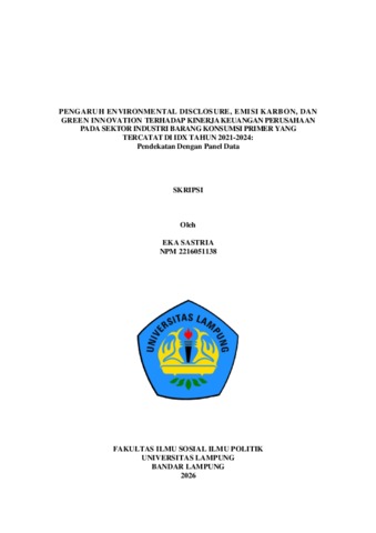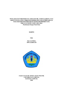 EKA , SASTRIA (2026) PENGARUH ENVIRONMENTAL DISCLOSURE, EMISI KARBON, DAN GREEN INNOVATION TERHADAP KINERJA KEUANGAN PERUSAHAAN PADA SEKTOR INDUSTRI BARANG KONSUMSI PRIMER YANG TERCATAT DI IDX TAHUN 2021-2024: Pendekatan Dengan Panel Data. FAKULTAS ILMU SOSIAL DAN ILMU POLITIK, UNIVERSITAS LAMPUNG.