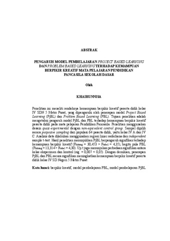 Penelitian ini meneliti rendahnya kemampuan berpikir kreatif peserta didik kelas IV SDN 5 Metro Pusat, yang dipengaruhi oleh penerapan model Project Based Learning (PjBL) dan Problem Based Learning (PBL). Tujuan penelitian adalah mengetahui pengaruh model PjBL dan PBL terhadap kemampuan berpikir kreatif peserta didik pada mata pelajaran Pendidikan Pancasila. Penelitian menggunakan desain quasi-experimental dengan non-equivalent control group. Sampel dipilih secara purposive sampling dari populasi 64 peserta didik, yaitu kelas IV A dan IV C. Analisis data dilakukan menggunakan regresi linier sederhana dan independent sample t-test. Hasil penelitian menunjukkan PjBL berpengaruh signifikan terhadap kemampuan berpikir kreatif (Fhitung = 30,453 > Ftabel = 4,35), begitu pula PBL (Fhitung = 13,314 > Ftabel = 4,30). Uji t juga menunjukan perbedaan signifikan antara kelas eksperimen dan kontrol (sig. = 0,007 < 0,05). Dengan demikian, penerapan PjBL dan PBL secara signifikan meningkatkan kemampuan berpikir kreatif peserta didik kelas IV SD Negeri 5 Metro Pusat. Kata kunci: berpikir kreatif, model pembelajaran PBL, model pembelajaran PjBL