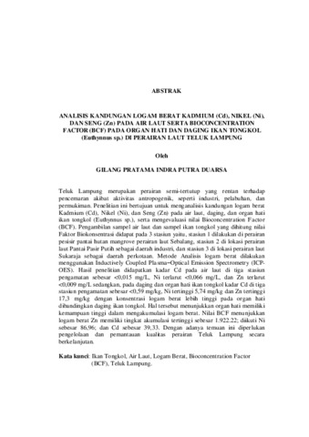 GILANG PRATAMA INDRA PUTRA, DUARSA (2026) ANALISIS KANDUNGAN LOGAM BERAT KADMIUM (Cd), NIKEL (Ni), DAN SENG (Zn) PADA AIR LAUT SERTA BIOCONCENTRATION FACTOR (BCF) PADA ORGAN HATI DAN DAGING IKAN TONGKOL (Euthynnus sp.) DI PERAIRAN LAUT TELUK LAMPUNG. Masters thesis, UNIVERSITAS LAMPUNG.