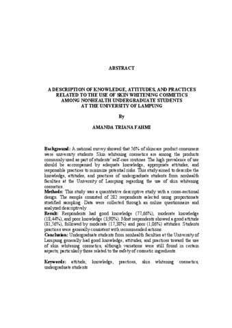 Amanda, Triana Fahmi (2026) GAMBARAN PENGETAHUAN, SIKAP, DAN PERILAKU TERKAIT PENGGUNAAN KOSMETIK PENCERAH KULIT PADA MAHASISWA PROGRAM SARJANA FAKULTAS NONKESEHATAN DI UNIVERSITAS LAMPUNG. KEDOKTERAN, UNIVERSITAS LAMPUNG .