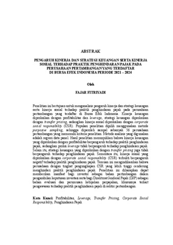Penelitian ini bertujuan untuk menganalisis pengaruh kinerja dan strategi keuangan serta kinerja sosial terhadap praktik penghindaran pajak pada perusahaan pertambangan yang terdaftar di Bursa Efek Indonesia. Kinerja keuangan diproksikan dengan profitabilitas dan leverage, strategi keuangan diproksikan dengan transfer pricing, sedangkan kinerja sosial diproksikan dengan corporate social responsibility (CSR). Populasi penelitian dipilih menggunakan metode purposive sampling, sehingga diperoleh sampel sebanyak 56 perusahaan pertambangan yang memenuhi kriteria penelitian. Metode analisis yang digunakan adalah regresi data panel. Hasil penelitian menunjukkan bahwa kinerja keuangan yang diproksikan dengan profitabilitas berpengaruh terhadap praktik penghindaran pajak, sedangkan proksi leverage tidak berpengaruh terhadap penghindaran pajak. Selain itu, strategi keuangan yang diproksikan dengan transfer pricing juga tidak berpengaruh terhadap penghindaran pajak. Sementara itu, kinerja sosial yang diproksikan dengan corporate social responsibility (CSR) terbukti berpengaruh negatif terhadap praktik penghindaran pajak. Temuan ini mengindikasikan bahwa perusahaan dengan tingkat pengungkapan CSR yang lebih tinggi cenderung menghindari praktik penghindaran pajak. Penelitian ini diharapkan dapat memberikan manfaat bagi investor sebagai bahan pertimbangan dalam pengambilan keputusan investasi serta bagi Direktorat Jenderal Pajak (DJP) sebagai bahan evaluasi dan perumusan kebijakan perpajakan, khususnya terkait pengawasan terhadap praktik penghindaran pajak di sektor pertambangan. Kata Kunci: Profitabilitas, Leverage, Transfer Pricing, Corporate Social Responsibility, Penghindaran Pajak This study aims to analyze the influence of financial performance, strategy, and social performance on tax avoidance practices in mining companies listed on the Indonesia Stock Exchange. Financial performance is proxied by profitability and leverage, financial strategy is proxied by transfer pricing, while social performance is proxied by corporate social responsibility (CSR). The study population was selected using a purposive sampling method, resulting in a sample of 56 mining companies that met the research criteria. The analytical method used is panel data regression. The results show that financial performance, proxied by profitability, influences tax avoidance practices, while leverage does not. In addition, financial strategy, proxied by transfer pricing, also does not influence tax avoidance. Meanwhile, social performance, proxied by corporate social responsibility (CSR), is proven to have a negative effect on tax avoidance practices. These findings indicate that companies with higher levels of CSR disclosure tend to avoid tax avoidance practices. This research is expected to provide benefits for investors as a consideration in making investment decisions and for the Direktorat Jenderal Pajak (DJP) as a material for evaluating and formulating tax policies, particularly regarding supervision of tax avoidance practices in the mining sector. Keywords: Profitability, Leverage, Transfer Pricing, Corporate Social Responsibility, Tax Avoidance