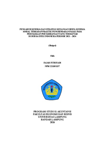 FAJAR, FITRIYADI (2026) PENGARUH KINERJA DAN STRATEGI KEUANGAN SERTA KINERJA SOSIAL TERHADAP PRAKTIK PENGHINDARAN PAJAK PADA PERUSAHAAN PERTAMBANGAN YANG TERDAFTAR DI BURSA EFEK INDONESIA PERIODE 2021 – 2024. FAKULTAS EKONOMI DAN BISNIS, UNIVERSITAS LAMPUNG.