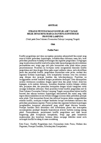 FADILA, PUTRI (2026) STRATEGI PENYELESAIAN KONFLIK PENGELOLAAN ASET TANAH MILIK PEMERINTAH DINAS BINA MARGA DAN BINA KONSTRUKSI PROVINSI LAMPUNG (Studi Pada Desa Sukosari Kecamatan Kalirejo Lampung Tengah). FAKULTAS ILMU SOSIAL DAN ILMU POLITIK , UNIVERSITAS LAMPUNG.