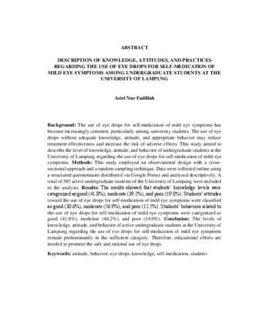 Background: The use of eye drops for self-medication of mild eye symptoms has become increasingly common, particularly among university students. The use of eye drops without adequate knowledge, attitude, and appropriate behavior may reduce treatment effectiveness and increase the risk of adverse effects. This study aimed to describe the level of knowledge, attitude, and behavior of undergraduate students at the University of Lampung regarding the use of eye drops for self-medication of mild eye symptoms. Methods: This study employed an observational design with a crosssectional approach and a random sampling technique. Data were collected online using a structured questionnaire distributed via Google Forms and analyzed descriptively. A total of 385 active undergraduate students of the University of Lampung were included in the analysis. Results: The results showed that students’ knowledge levels were categorized as good (41.8%), moderate (39.2%), and poor (19.0%). Students’ attitudes toward the use of eye drops for self-medication of mild eye symptoms were classified as good (30.6%), moderate (56.9%), and poor (12.5%). Students’ behaviors related to the use of eye drops for self-medication of mild eye symptoms were categorized as good (41.8%), moderate (44.2%), and poor (14.0%). Conclusion: The levels of knowledge, attitude, and behavior of active undergraduate students at the University of Lampung regarding the use of eye drops for self-medication of mild eye symptoms remain predominantly in the sufficient category. Therefore, educational efforts are needed to promote the safe and rational use of eye drops. Keywords: attitude, behavior, eye drops, knowledge, self-medication, students Latar Belakang: Penggunaan obat tetes mata untuk swamedikasi keluhan mata ringan semakin banyak dilakukan, terutama di kalangan mahasiswa. Penggunaan obat tetes mata yang tidak disertai dengan pengetahuan, sikap, dan perilaku yang tepat berpotensi menurunkan efektivitas terapi serta meningkatkan risiko efek yang tidak diinginkan. Penelitian ini bertujuan untuk mengetahui tingkat pengetahuan, sikap, dan perilaku mahasiswa aktif S1 Universitas Lampung mengenai penggunaan obat tetes mata untuk swamedikasi keluhan mata ringan. Metode: Metode penelitian yang digunakan adalah observasional dengan desain potong lintang, menggunakan teknik pengambilan sampel secara acak. Pengumpulan data dilakukan secara daring melalui kuesioner terstruktur menggunakan Google Form, dengan analisis data secara deskriptif. Jumlah responden yang dianalisis dalam penelitian ini sebanyak 385 mahasiswa aktif S1 Universitas Lampung. Hasil: Hasil penelitian menunjukkan bahwa tingkat pengetahuan mahasiswa berada pada kategori baik sebesar 41,8%, cukup sebesar 39,2%, dan kurang sebesar 19,0%. Sikap mahasiswa terhadap penggunaan obat tetes mata untuk swamedikasi keluhan mata ringan berada pada kategori baik sebesar 30,6%, cukup sebesar 56,9%, dan kurang sebesar 12,5%. Perilaku mahasiswa dalam penggunaan obat tetes mata untuk swamedikasi keluhan mata ringan berada pada kategori baik sebesar 41,8%, cukup sebesar 44,2%, dan kurang sebesar 14,0%. Kesimpulan: Tingkat pngetahuan, sikap, dan perilaku mahasiswa aktif S1 Universitas Lampung terhadap penggunaan obat tetes mata untuk swamedikasi keluhan mata ringan masih berada pada kategori cukup, sehingga diperlukan upaya edukasi untuk meningkatkan penggunaan obat tetes mata yang aman dan rasional. Kata Kunci: mahasiswa, obat tetes mata, pengetahuan, perilaku, sikap, swamedikas