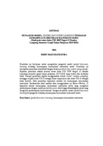Penelitian ini bertujuan untuk mengetahui pengaruh model guided discovery learning terhadap kemampuan komunikasi matematis siswa. Penelitian ini merupakan penelitian kuantitatif dengan desain posttest only control group design. Populasi penelitian adalah seluruh siswa kelas VIII SMP Negeri 32 Bandar Lampung semester ganjil tahun pelajaran 2025/2026 yang terdiri atas sembilan kelas. Sampel penelitian dipilih menggunakan teknik cluster random sampling, sehingga terpilih kelas VIII E sebagai kelas eksperimen dan kelas VIII G sebagai kelas kontrol. Data penelitian diperoleh melalui tes kemampuan komunikasi matematis. Berdasarkan hasil analisis data menggunakan uji Mann–Whitney U, diperoleh bahwa kemampuan komunikasi matematis siswa yang mengikuti pembelajaran dengan model guided discovery lebih tinggi dibandingkan siswa yang mengikuti pembelajaran konvensional. Dengan demikian, model guided discovery learning berpengaruh terhadap kemampuan komunikasi matematis siswa. Kata kunci: guided discovery learning, kemampuan komunikasi matematis