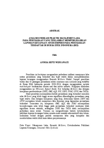 ANNISA , SEPTI WIDYAWATI (2026) ANALISIS INDIKASI PRAKTIK MANAJEMEN LABA PADA PERUSAHAAN YANG TERLAMBAT MEMPUBLIKASIKAN LAPORAN KEUANGAN: STUDI EMPIRIS PADA PERUSAHAAN TERDAFTAR DI BURSA EFEK INDONESIA (BEI). FAKULTAS EKONOMI DAN BISNIS, UNIVERSITAS LAMPUNG.