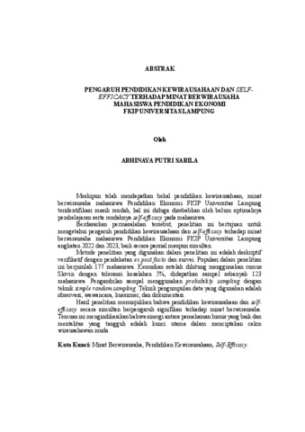 ABHINAYA PUTRI , SABILA (2026) PENGARUH PENDIDIKAN KEWIRAUSAHAAN DAN SELF-EFFICACY TERHADAP MINAT BERWIRAUSAHA MAHASISWA PENDIDIKAN EKONOMI FKIP UNIVERSITAS LAMPUNG. FAKULTAS KEGURUAN DAN ILMU PENDIDIKAN, UNIVERSITAS LAMPUNG.