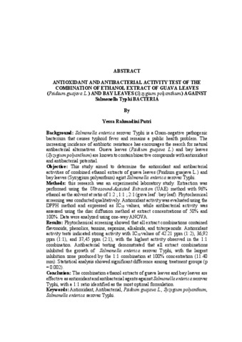 YESSA, RAHMADINI PUTRI (2026) UJI AKTIVITAS ANTIOKSIDAN, ANTIBAKTERI KOMBINASI EKSTRAK ETANOL DAUN JAMBU BIJI (Psidium guajava linn) dan DAUN SALAM (Syzygium polyanthum) TERHADAP BAKTERI Salmonella typhi. FAKULTAS KEDOKTERAN, UNIVERSITAS LAMPUNG.