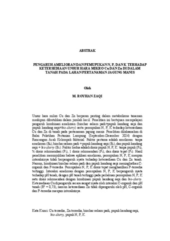 M. Royhan, Zaqi (2026) PENGARUH AMELIORAN DAN PEMUPUKAN N, P, DAN K TERHADAP KETERSEDIAAN UNSUR HARA MIKRO Cu DAN Zn DI DALAM TANAH PADA LAHAN PERTANAMAN JAGUNG MANIS. FAKULTAS PERTANIAN, UNIVERSITAS LAMPUNG.