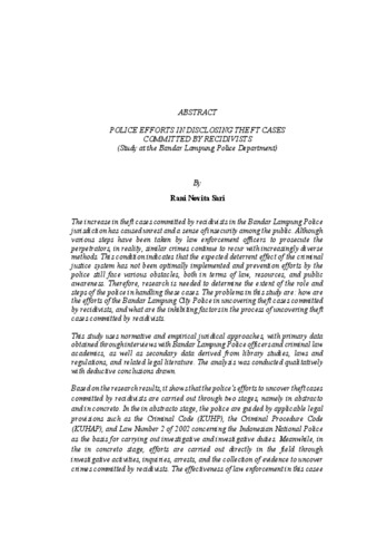 RANI, NOVITA SARI (2026) UPAYA KEPOLISIAN DALAM PENGUNGKAPAN PERKARA PENCURIAN YANG DILAKUKAN OLEH RESIDIVIS (Studi Di Polresta Bandar Lampung). FAKULTAS HUKUM, UNIVERSITAS LAMPUNG.