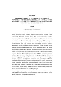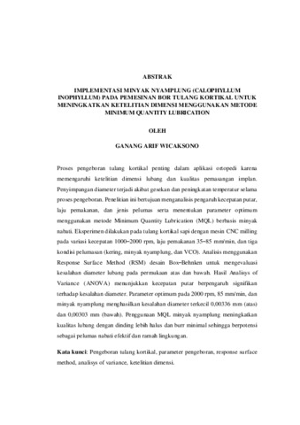 GANANG ARIF , WICAKSONO (2026) IMPLEMENTASI MINYAK NYAMPLUNG (CALOPHYLLUM INOPHYLLUM) PADA PEMESINAN BOR TULANG KORTIKAL UNTUK MENINGKATKAN KETELITIAN DIMENSI MENGGUNAKAN METODE MINIMUM QUANTITY LUBRICATION. FAKULTAS TEKNIK, UNIVERSITAS LAMPUNG.
